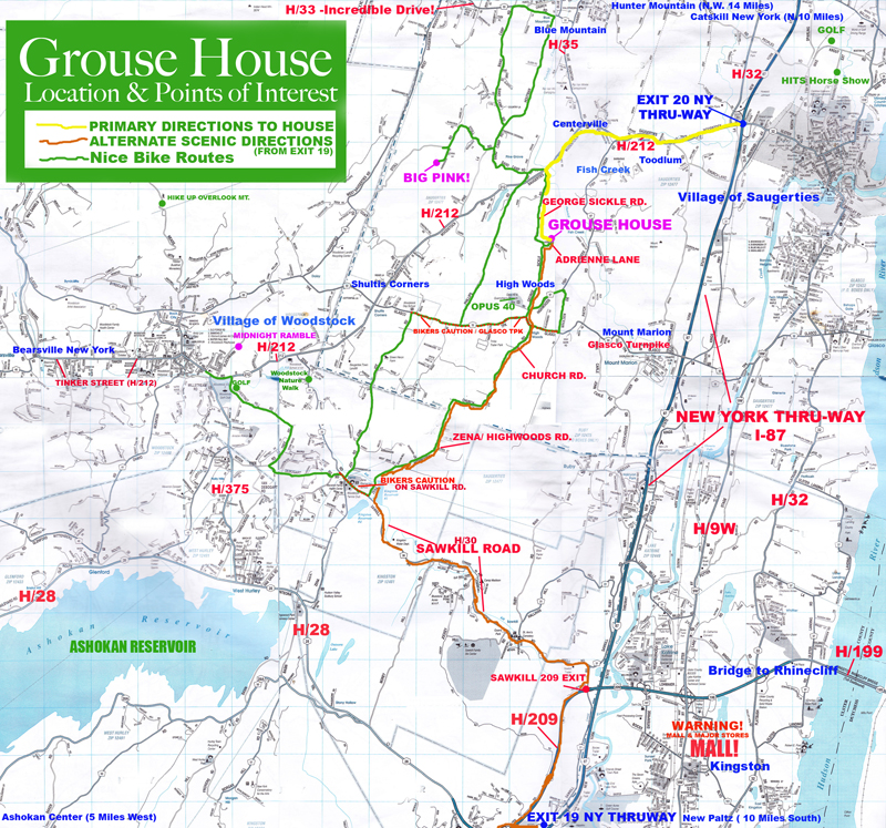 The Woodstock Festival was NOT held in Woodstock New York. Different legends explain why and how the name stuck but it’s about a 70 MINUTE drive from the house and something you might want to do coming up from or going to the NYC area. However... it should be noted that the drive there is absolutely spectacular if you are going FROM The Grouse House and you set you GPS for the "shortast distance"... rather than "fastest time". It will take you through the mountains... passing beautiful reservoirs and streams as well as an eagles nest on an island if you know where to look (you'll see all the people pulled over with cameras and binoculars).
