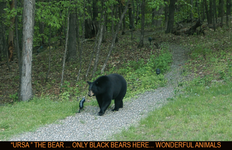 In the past few years bears have been frequently seen here with one named "Ursa" living near the property and visiting regularly for five years. She had three cubs here... which she paraded proudly for their first year around the property about three times a week. She knew she was safe here as she had been coming here since she was born. In the cubs second year she vanished with them... probably to take them to a larger wilderness area that could accomodate the territories of four bears as the family was headed for the second year "break up". But in 2015 there have only been around a dozen here all year long... and they all seemed to be just passing through. I am careful NOT TO FEED THEM and guests should not either.
